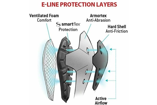Nový chránič E-Line Elbow Guards je navržen pro ty nejnáročnější jízdy. Chránič je vybaven novými odolnými prvky, které umožní jezdci dovolit si víc a v případě pádu ho také více ochrání. Chránič kryje tvrdá skořepina, která lépe snáší přímý kontakt s terénem při pádu, aniž by se celý chránič mohl poškodit. Pod ní je umístěna další ochranná vrstva - tkanina Armortex odolná proti roztržení a oděru. Nejdůležitější vrstvu tvoří Smartflex – aktivní pěna G-Form, která nárazem ztuhne a lépe rozloží tlak na větší plochu a ochrání tak jezdce před poraněním. Poslední, vnitřní, vrstvou je měkká pěnová výstelka pro pohodlné nošení a jistější usazení chrániče. Nastavitelný spodní pásek se suchým zipem stabilizuje celý návlek. Větrání je zajištěno síťovinou použitou na zadní straně návleku a větracími kanály ve všech vrstvách chrániče.
