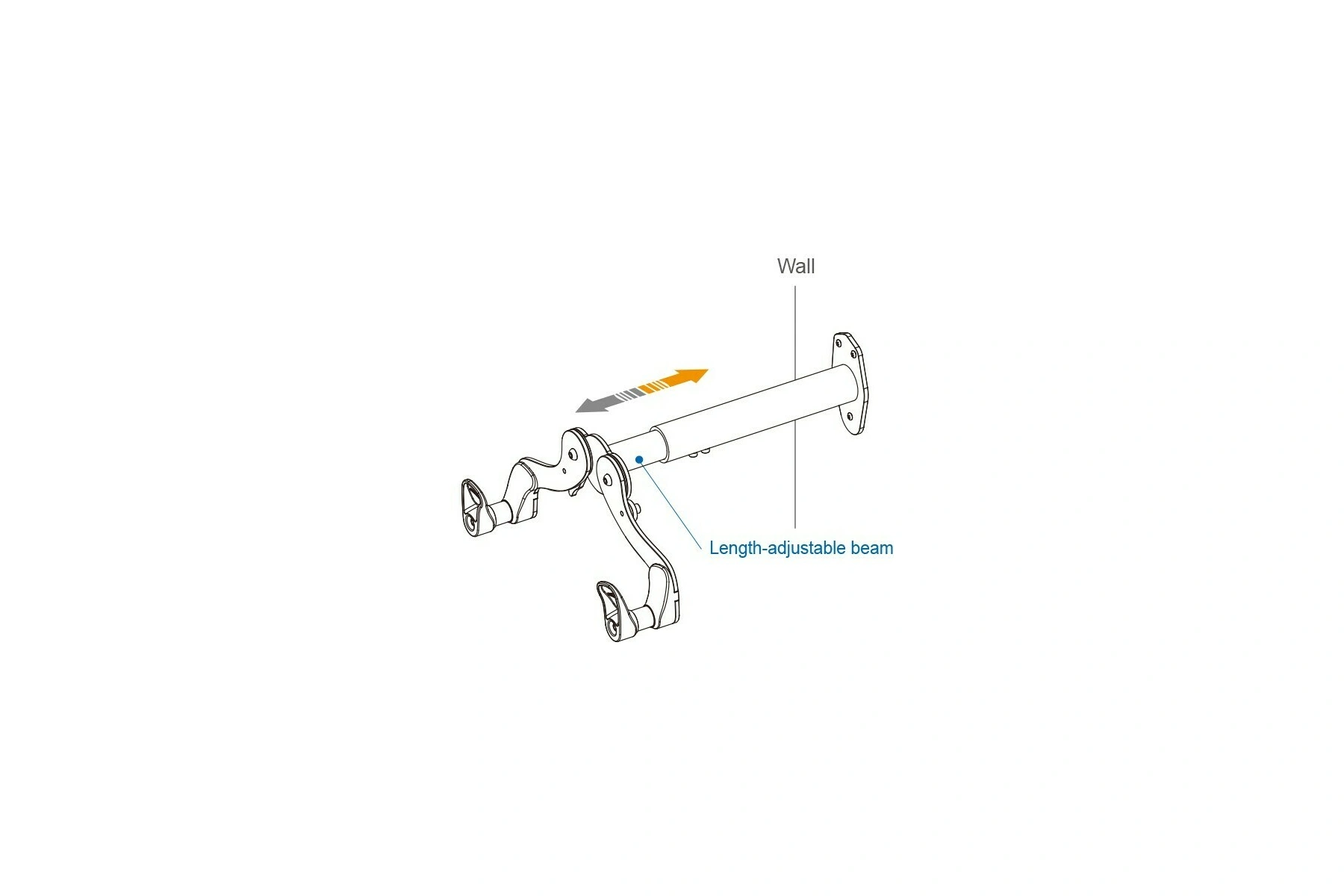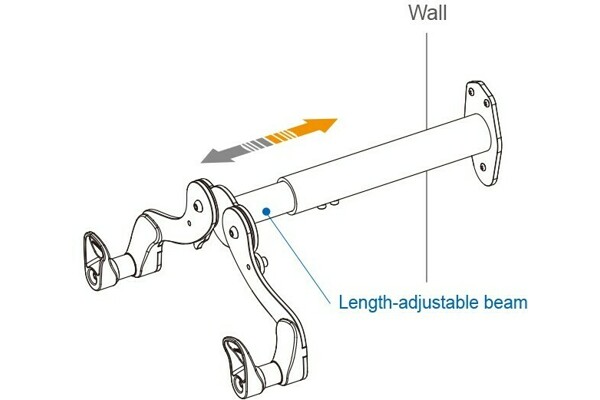 Maximálně nastavitelný držák kol na zeď. Kolo se zavěsí za horní rámovou trubku. Lze nastavit jak rozteč dosedacích háků, tak vzdálenost držáku od stěny. Samotné háky jsou vyrobeny z plastu a na kontaktních místech navíc obsahují i gumové podložky.