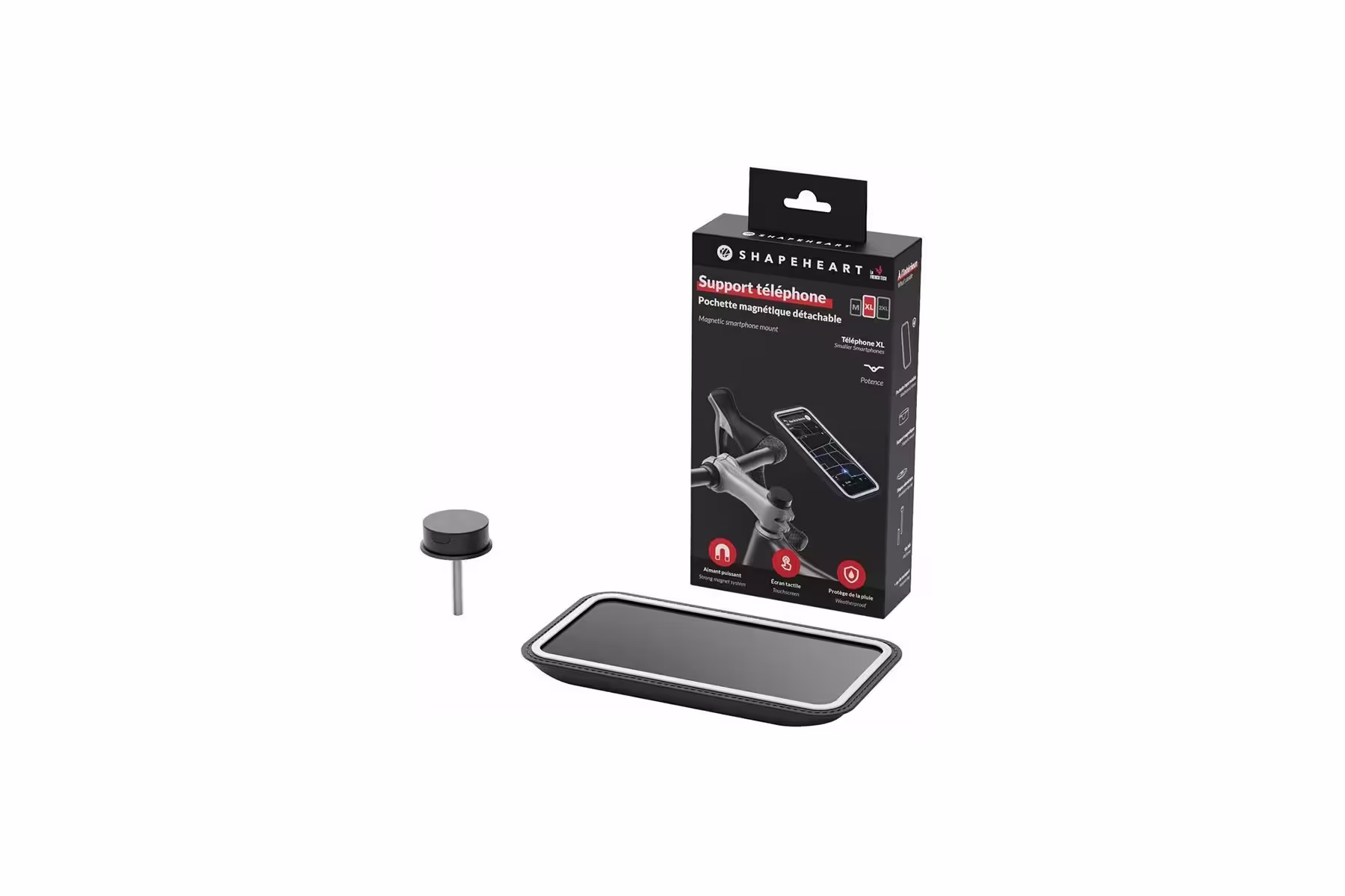 Shapeheart Bike Stem magnetický držák na telefon s pouzdrem. Unikátní magnetický držák do víčka představce s pouzdrem na telefon pro použití na jízdním kole. Sada je dostupná ve 3 velikostech pouzdra podle velikosti telefonu (M, XL a XXL). Pouzdro na telefon je voděodolné, má průzor pro fotokameru a také vstup na sluchátka nebo USB, takže můžete telefon dokonce i za jízdy nabíjet. Držák se montuje místo původního víčka představce a je kompatibilní s krky vidlic 1“1/8 a šroubem M6. Telefon lze snadno ovládat i v pouzdru, dotykový displej funguje i přes krycí fólii.