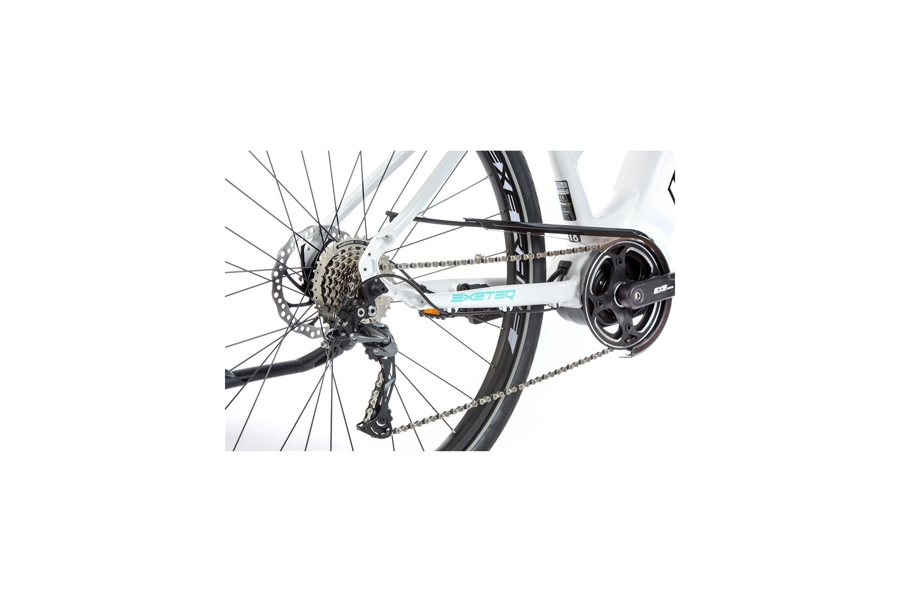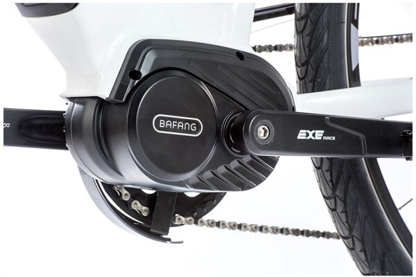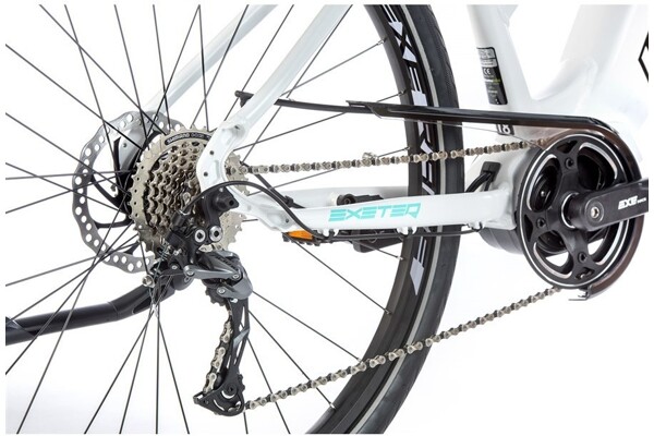 Novinka pro sezónu 2020 krosové elektrokolo EXETER 2020 s hliníkovým rámem, sportovním designem, odpruženou přední vidlicí, kotoučovými brzdami a rozměrem kol 28“ a centrálním motorem Bafang MODEST. Motor je vybaven integrovaným snímačem otáček.