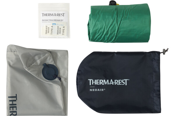 Součástí karimatky je nafukovací vak, kompresní obal a opravná sada.