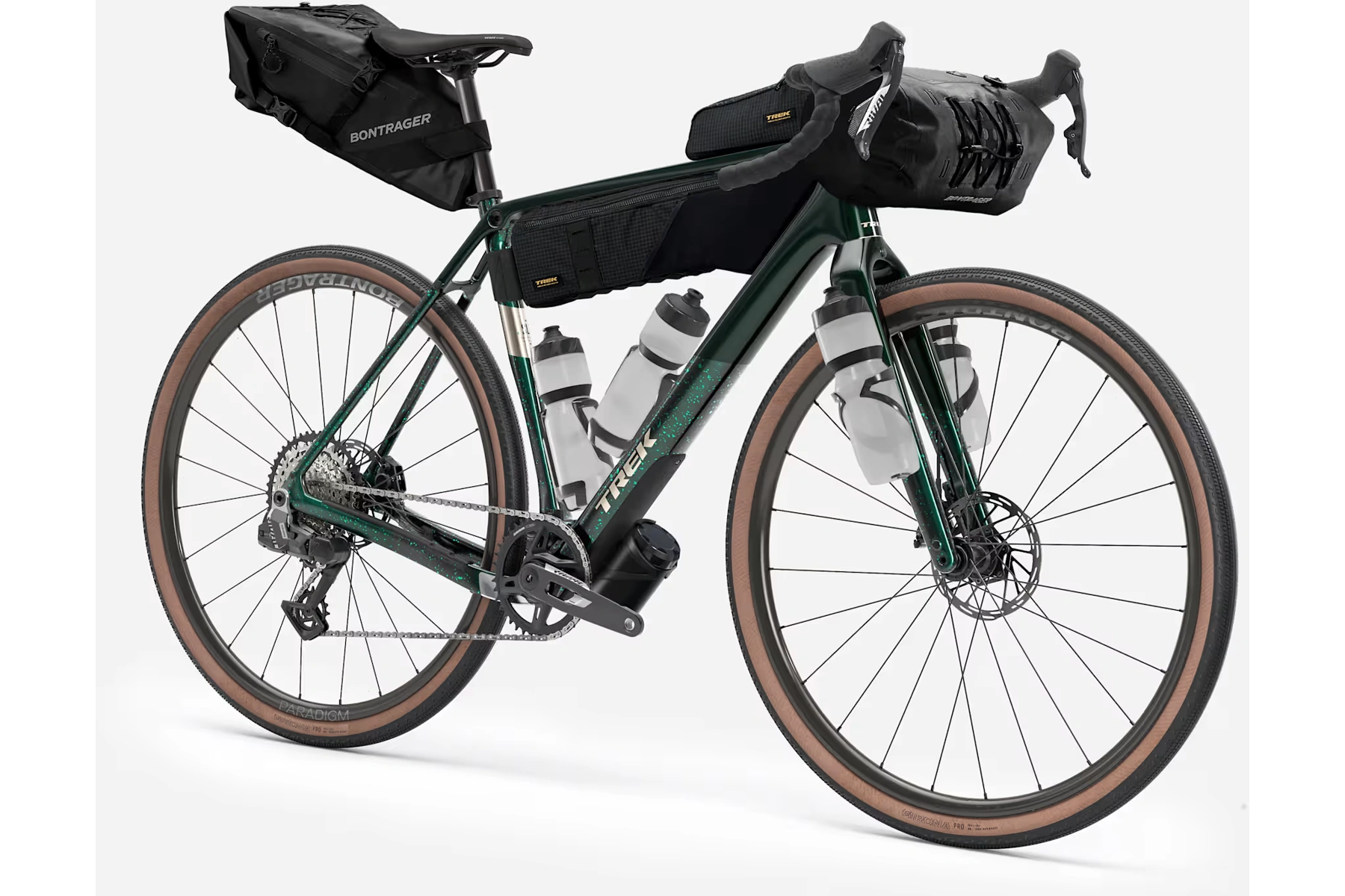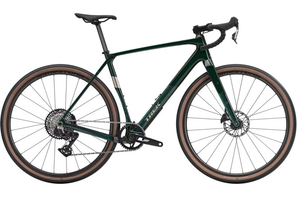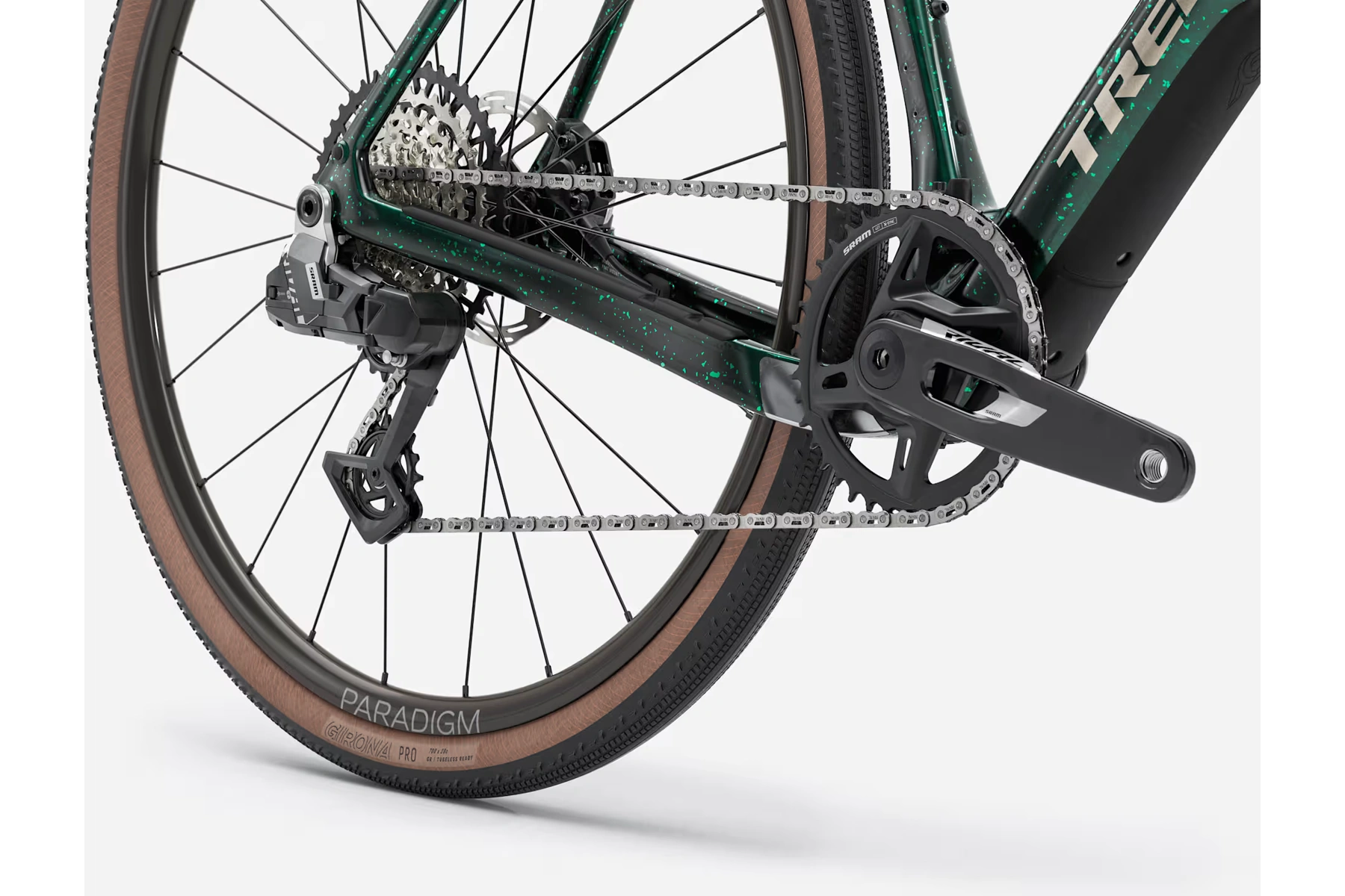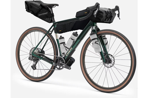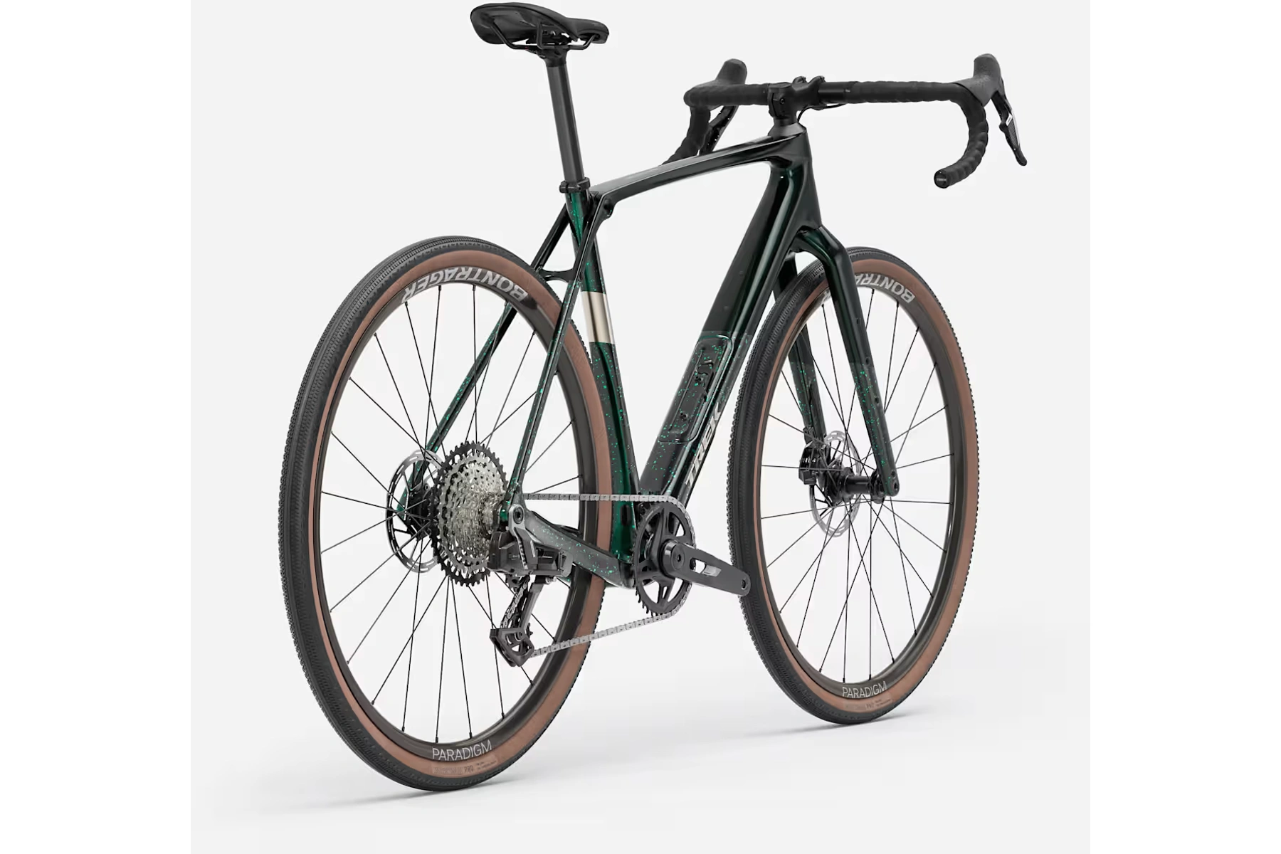 13rychlostní zcela bezdrátové řazení 1x SRAM Rival AXS E1, hydraulické kotoučové brzdy, karbonová sedlovka a kola Bontrager Paradigm Comp se 42mm plášti připravená na bezdušovou verzi.
