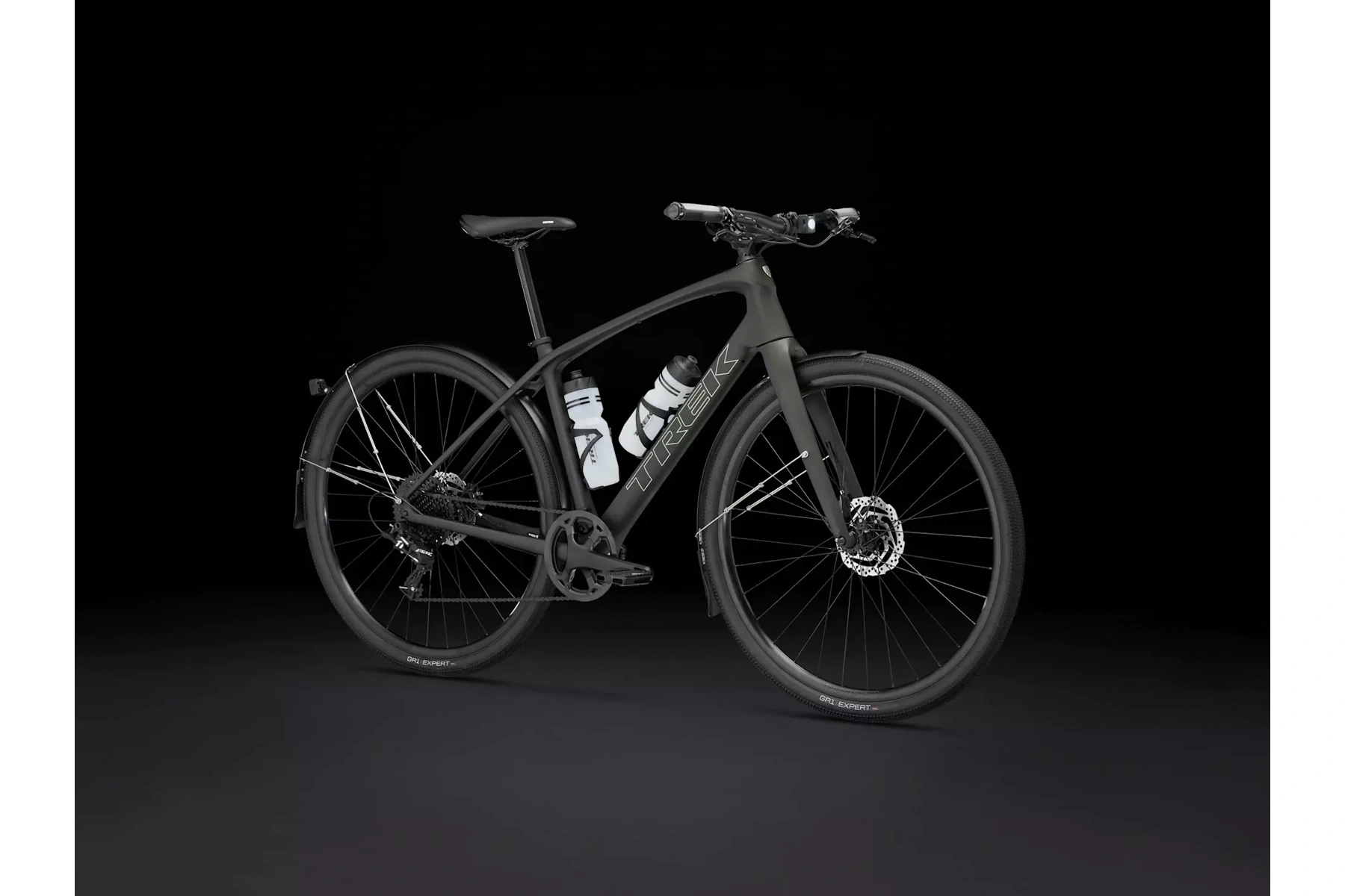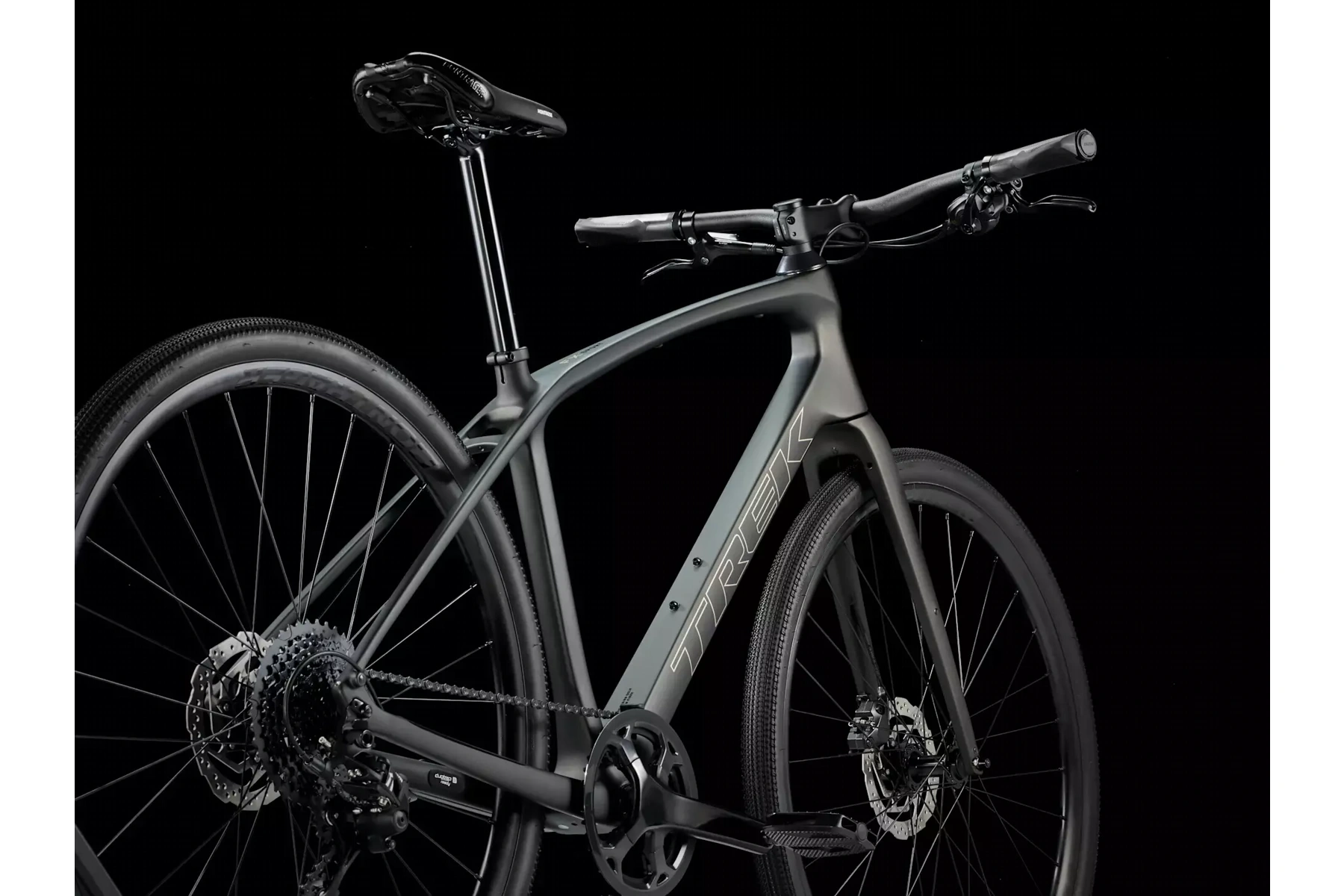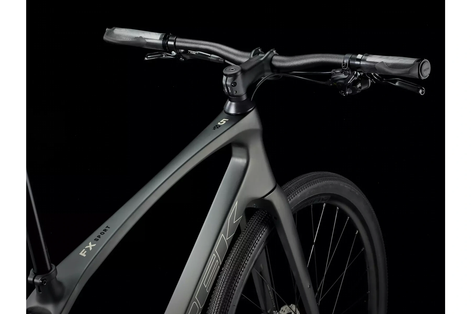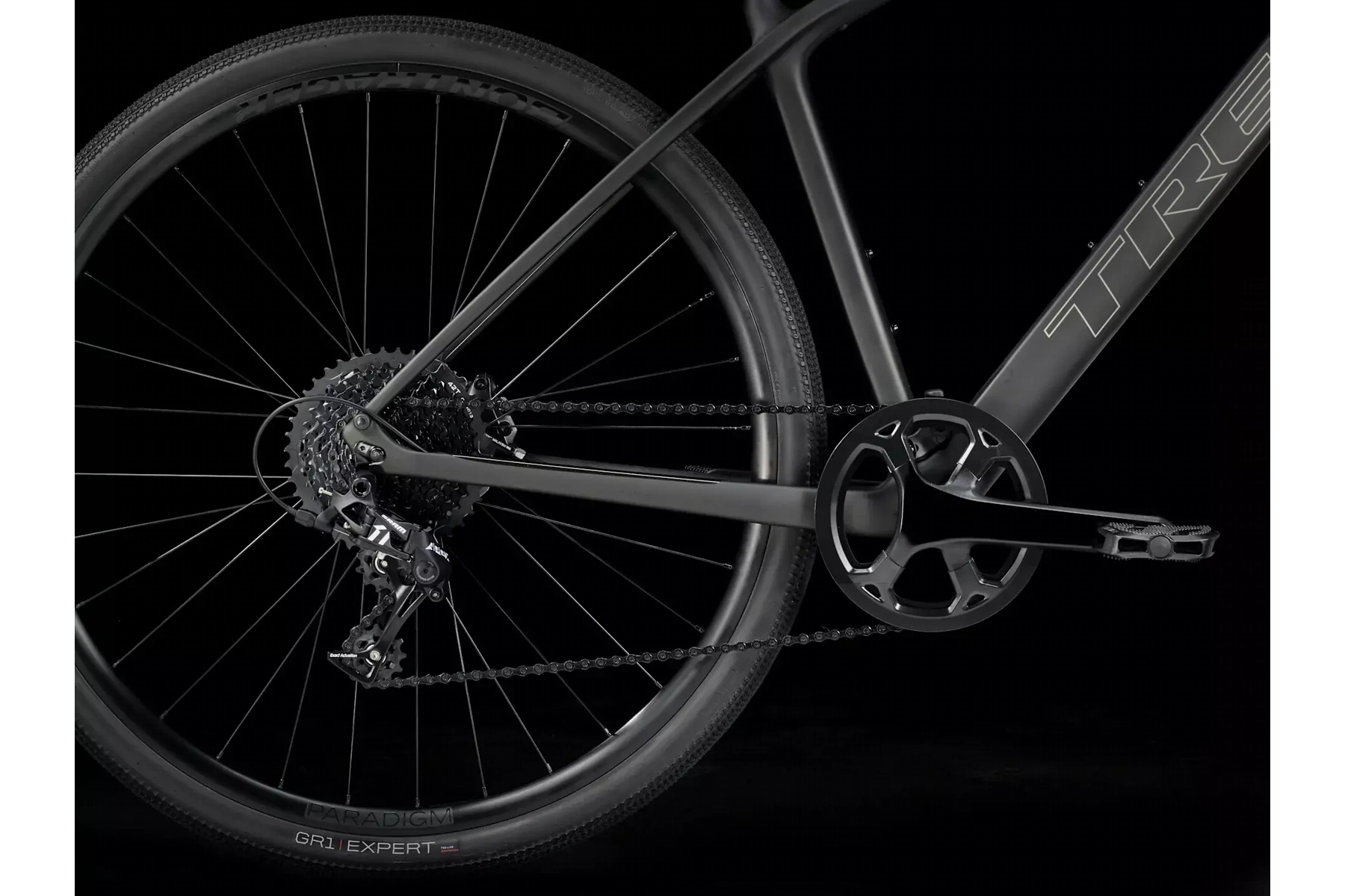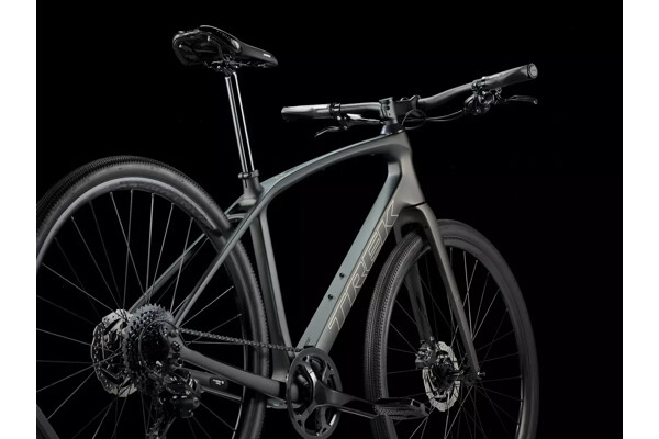 Skryté úchyty na blatníky, lehká sada slitinových kol Bontrager Paradigm umožňující použití bezdušových plášťů, široké a rychlé gravelové pláště Bontrager GR1 Expert a řídítka s ergonomickými gripy tlumící vibrace.