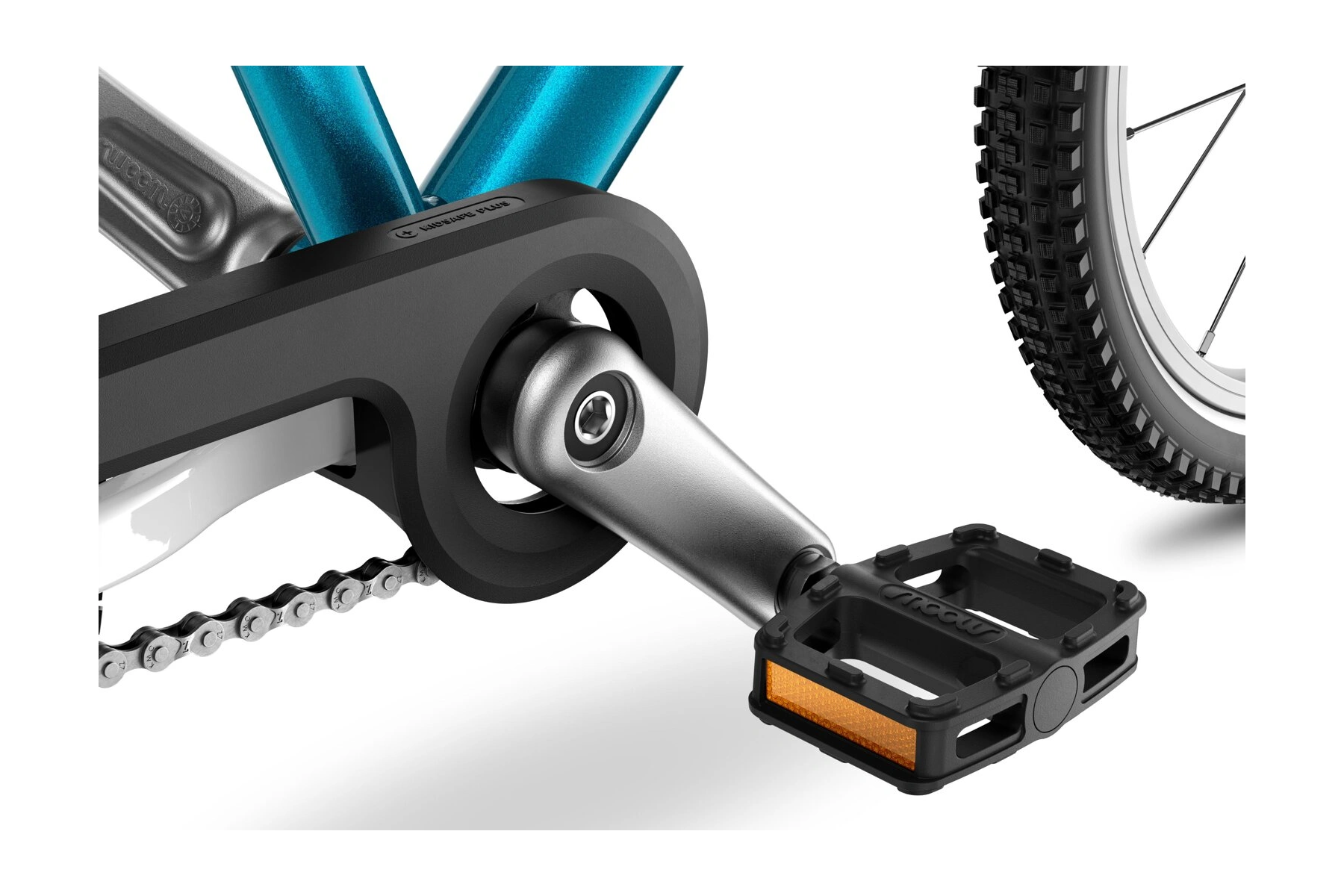 Kompaktní kryt řetězu ochrání děti před zraněním a špínou a současně umožňuje snadný přístup pro servis řetězu.