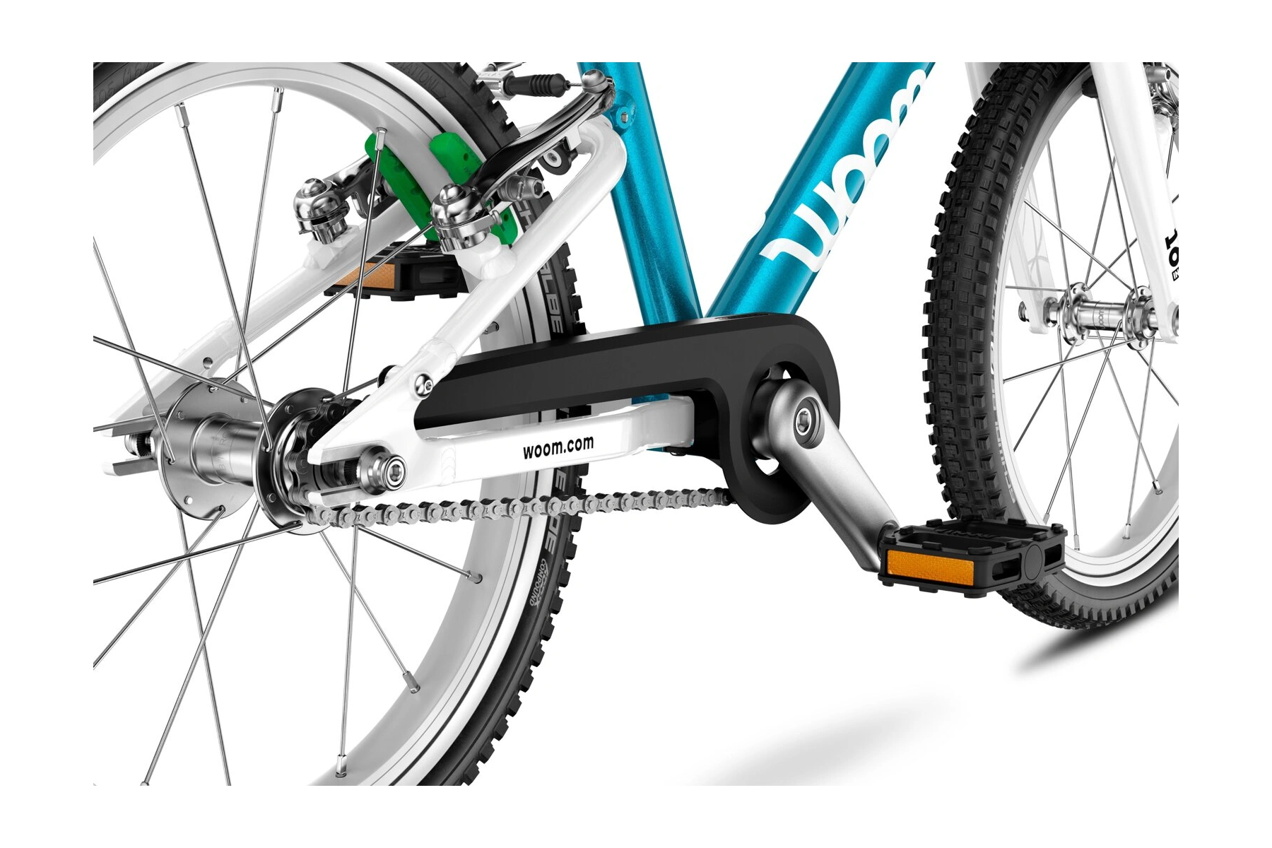 Woom GO 3 přijíždí s vysoce kvalitními koly, která byla pečlivě navržena do posledního detailu. Lehké pláště Schwalbe zvládnou jízdu na štěrku, asfaltu i v lehkém terénu. Mají reflexní pruh, díky kterému bude dítě vidět i za šera.