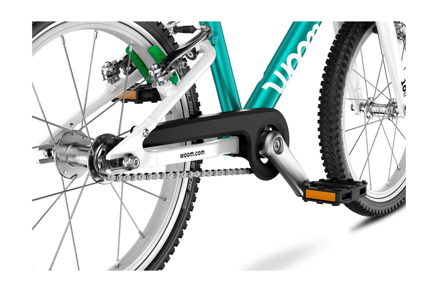 Woom GO 3 přijíždí s vysoce kvalitními koly, která byla pečlivě navržena do posledního detailu. Lehké pláště Schwalbe zvládnou jízdu na štěrku, asfaltu i v lehkém terénu. Mají reflexní pruh, díky kterému bude dítě vidět i za šera.