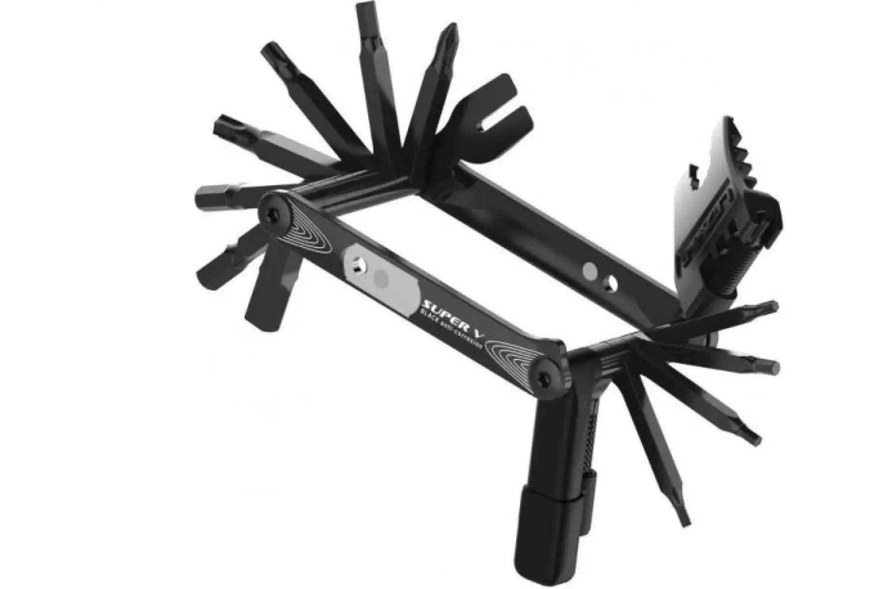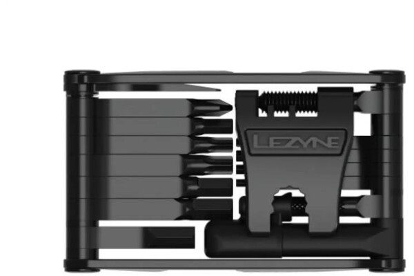 Obsahuje: imbusové klíče 2/ 2,5/3/4/5/6/8 mm, Torx T10 / T25 / T30, klíč stranový 8/10 mm, šroubovák křížový, nýtovač pro 9/10/11/12-rychlostní řetězy, centrklíče SW-0 (3,2 mm), SW-1 (3,3 mm), SW-2 (3,45 mm), SW-3 (3,96 mm), nástroj na vyrovnávání brzdových kotoučů, otvírák lahví, možnost uložení rychlospojky, sada na opravu bezdušových plášťů