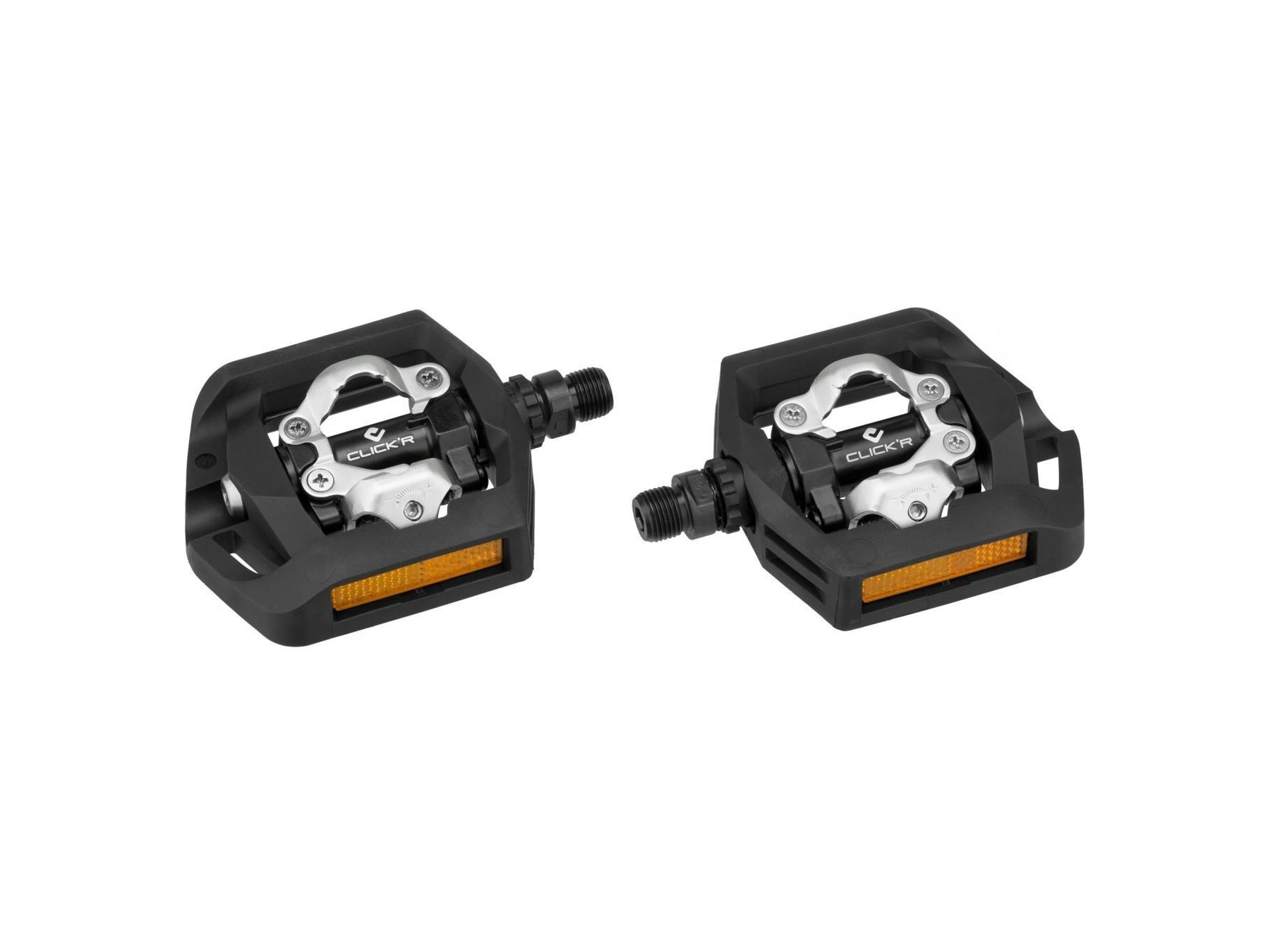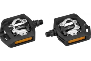 Pedály pro horská a trekingová kola, které jsou nášlapné z jedné strany se zámky CLICKR a druhá strana je platformová bez pinů.