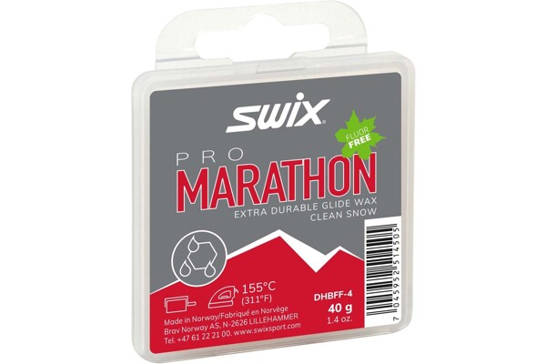 Tvrdý a extra odolný skluzný vosk s černým aditi-vem pro distanční závodyTento vosk byl vyvinutý speciálně pro distanční závody na vlhkém a špinavém sněhu. Aditivum eli-minuje tření způsobené nečistotami obsaženými ve sněhu. Nejlépe funguje v teplejších podmín-kách kolem 0°C a v plusových teplotách, ale má dobré výsledky i v mínusových teplotách. Rychlost zažehlování by měla být zhruba 8 až 10 vteřin na skate lyži. Pro dosažení lepšího výsledku může být vosk po zchladnutí na pokojovou teplotu (zhruba po 10 min) znovu zažehlen. Následně strhněte ještě teplý vosk (zhruba 1 minutu po zažehlení). Marathon lze použít samostatně jako závodní vosk nebo jako základ pod prášky a urychlovače. Je důle-žité mít kvalitní žehličku, u které můžete přesně nastavit optimální teplotu zažehlování.Doporučená teplota zažehlování: 155