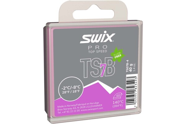 TS7 FIALOVÝ -2°C až -8°C TS7 je všestranný vosk vhodný do běžných podmínek pod bodem mrazu. Díky jeho tvrdosti se s ním dobře pracuje a snadno dosáhnete bezchybné aplikace. Černé aditivum působí jako pevný lubrikant a snižuje tření na špinavém sněhu nebo ledu. Je používán v běžeckém i sjezdovém lyžování na umělém nebo straším přeměněném sněhu. TS7B lze použít samostatně jako závodní vosk nebo jako základ pod prášky a urychlovače. Doporučená teplota zažehlování: 140°C Nahrazuje HF07WBX.