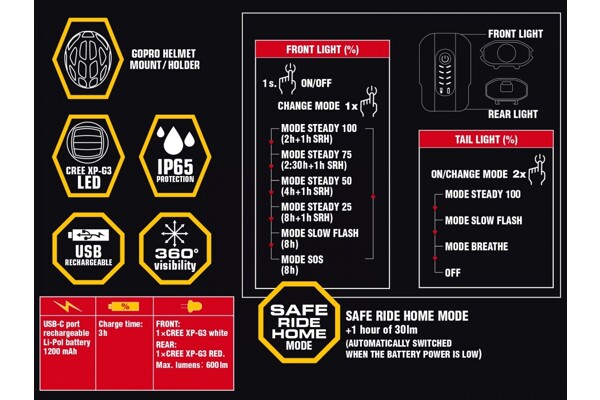 • Přední LED CREE XP-G3 600 lm / zadní 2 x červená LED.