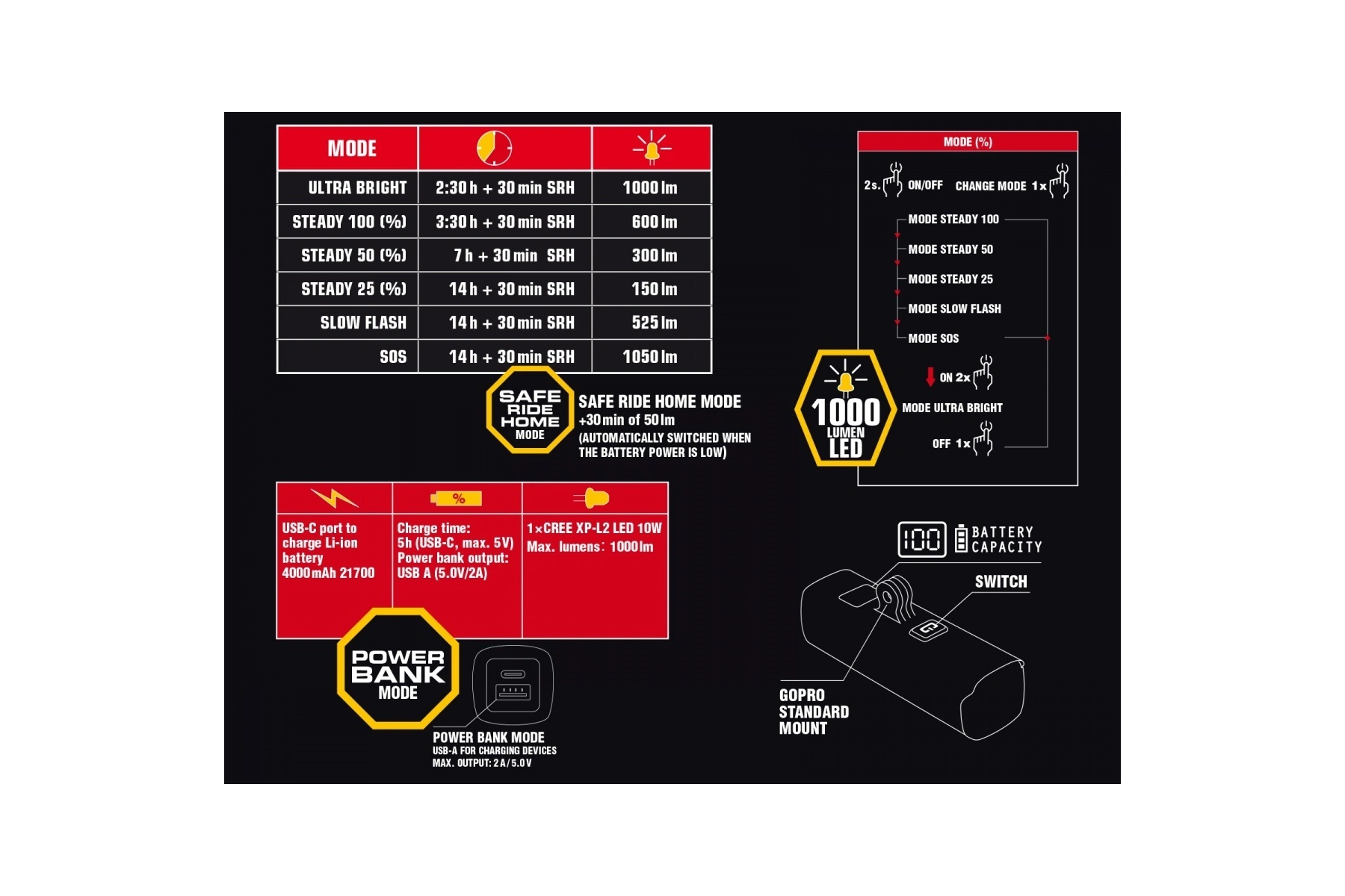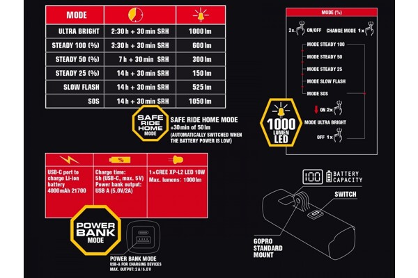 • Safe mode – při nízké kapacitě baterie se světlo automaticky přepne do úsporného režimu, ve kterém vydrží svítit 30 minut.