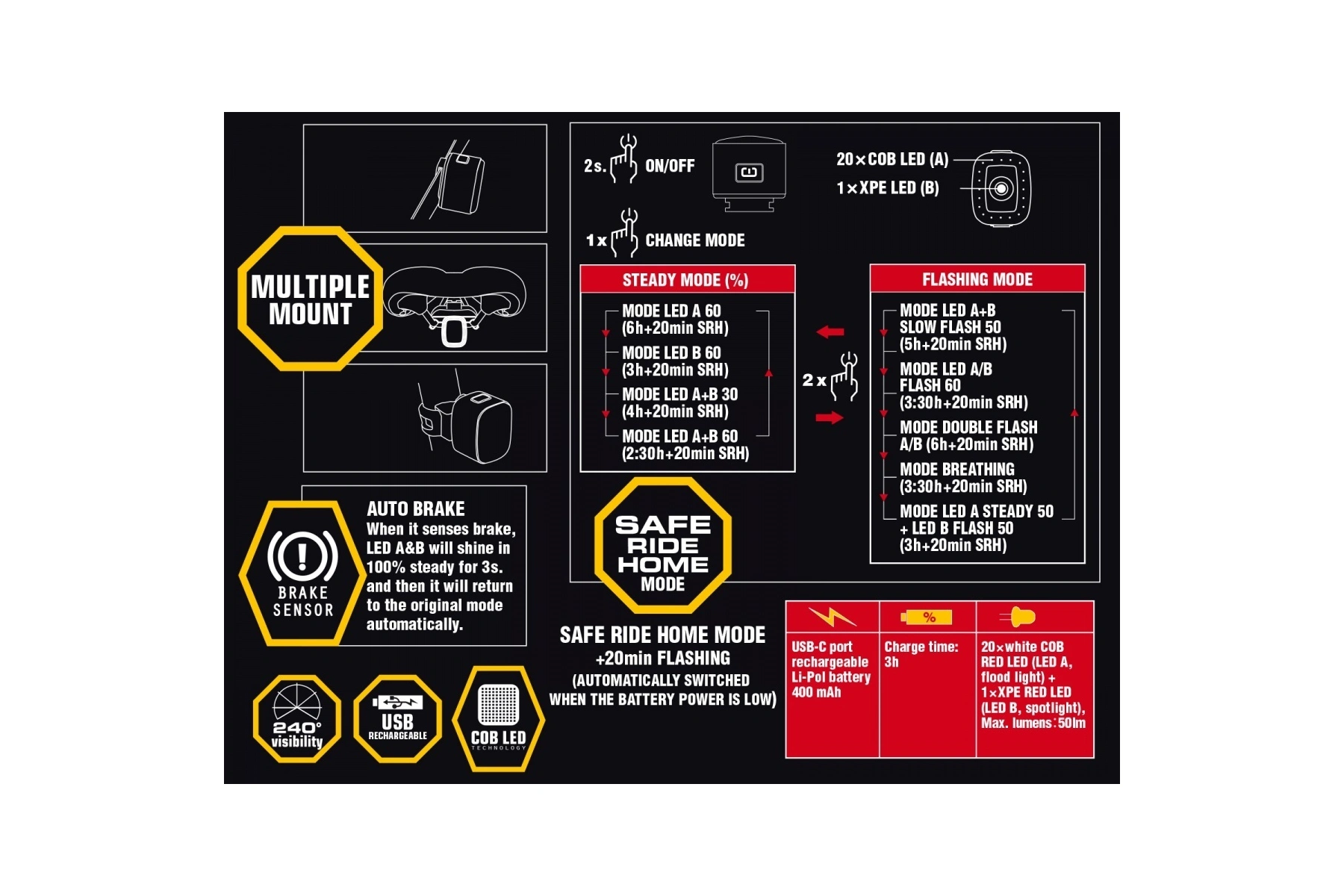 • AUTOMATIC BRAKE SENSOR – jakmile začnete brzdit, všechny LED čipy se rozsvítí na 100 % výkonu po dobu 3 s, po tomto intervalu se vrátí zpět do původního režimu.