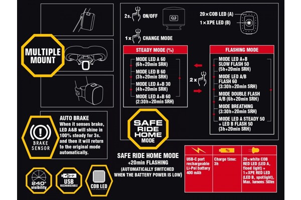 • Safe Ride Home mode – při nízké kapacitě baterie se světlo automaticky přepne do úsporného režimu, ve kterém vydrží svítit 20 minut.