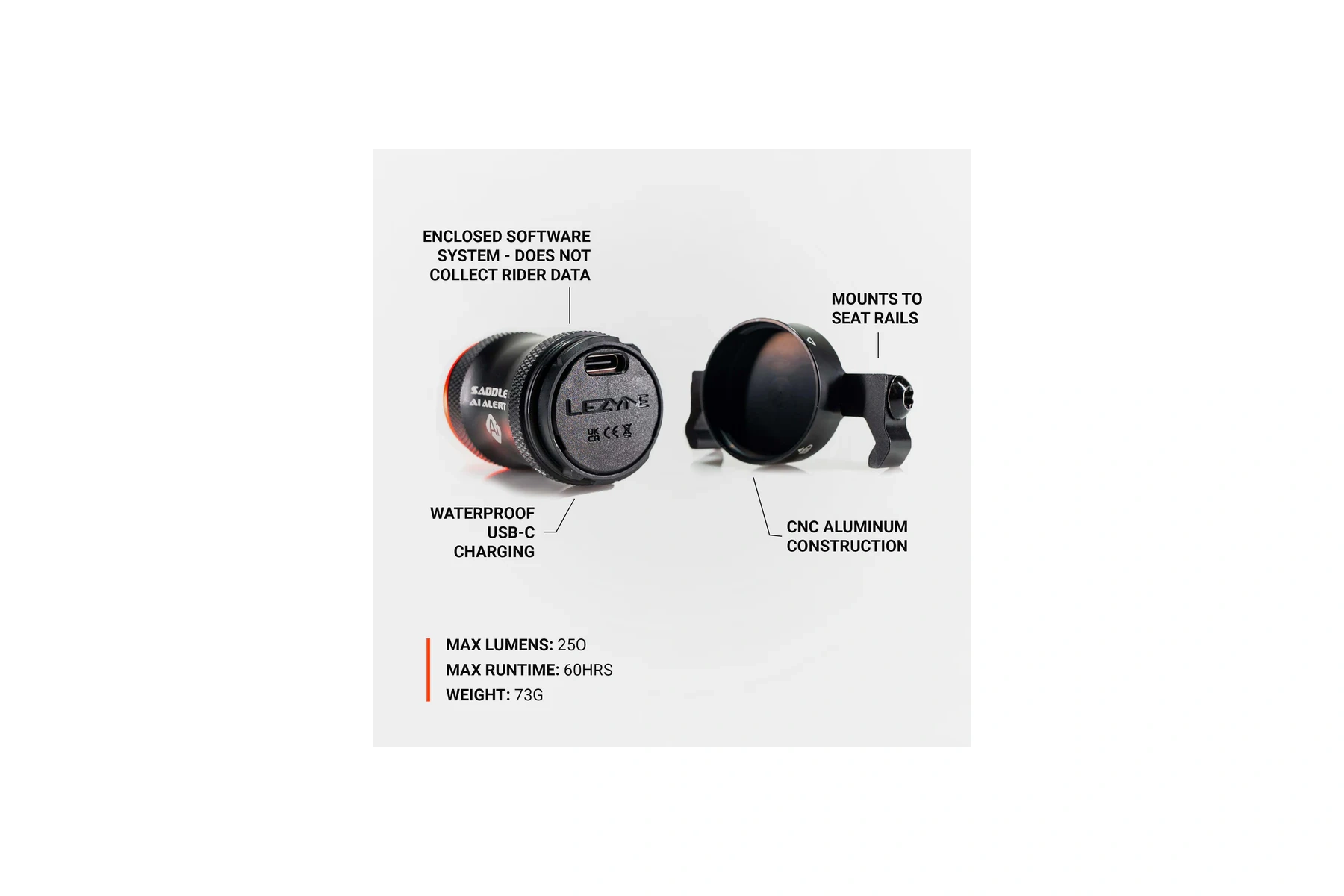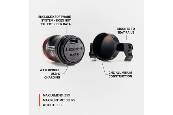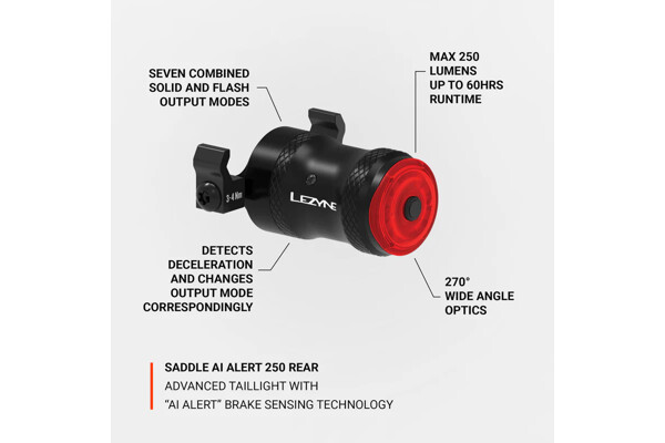 Světlo automaticky detekuje brzdové události a inteligentně mění výstupní režim Active Alert - rychlý 250-kulový bleskový režim "za brzdového světla"; signalizuje zpomalení, efektivně sdělování vašich akcí s provozem a ostatními cyklisty, zvyšující se viditelnost a bezpečnost jezdce.